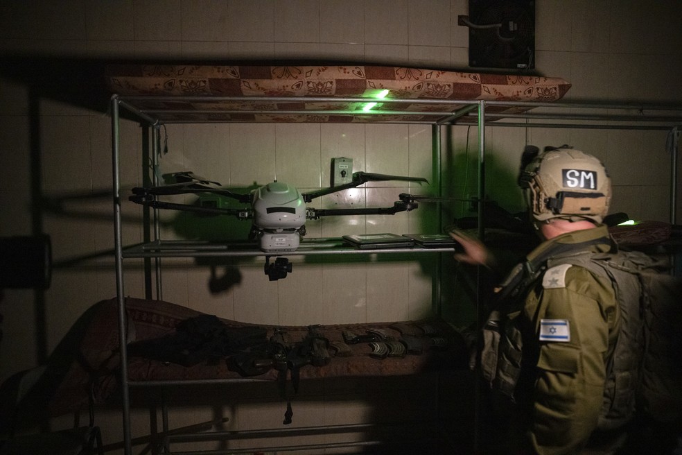 Soldado israelense mostra armas e drone encontrados no hospital al-Shifa — Foto: Daniel Berehulak/The New York TimesOs materiais destacam outros desafios para os militares israelenses. Os folhetos do Hamas mostram os pontos fracos dos tanques Merkava, enviados para operar na Faixa de Gaza, com os seus enormes canhões de 120 milímetros, bem como dos veículos blindados de transporte de pessoal israelense. Os combatentes do Hamas também têm instruções sobre que tipo de ogiva usar contra os blindados de Israel.